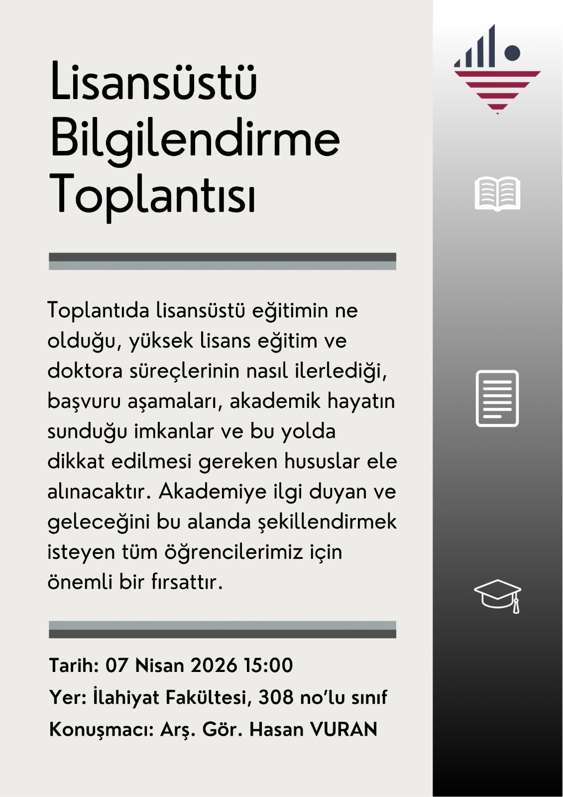 Toplantıda; lisansüstü eğitimin ne olduğu, yüksek lisans ve doktora süreçlerinin nasıl ilerlediği, başvuru aşamaları, akademik hayatın sunduğu imkânlar ve bu yolda dikkat edilmesi gereken hususlar ele alınacaktır.
