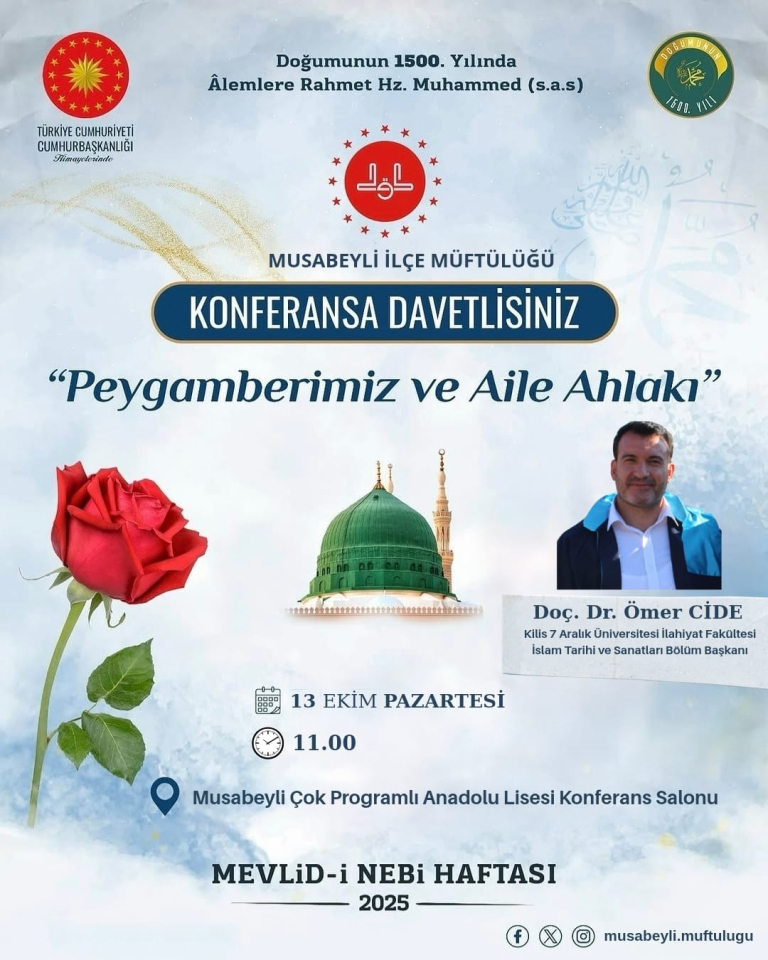 Doç. Dr. Ömer CİDE, 13 Ekim 2025 tarihinde Musabeyli İlçe Müftülüğü ev sahipliğinde düzenlenen programda “Peygamberimiz ve Aile Ahlakı” başlıklı bir konferans verdi.