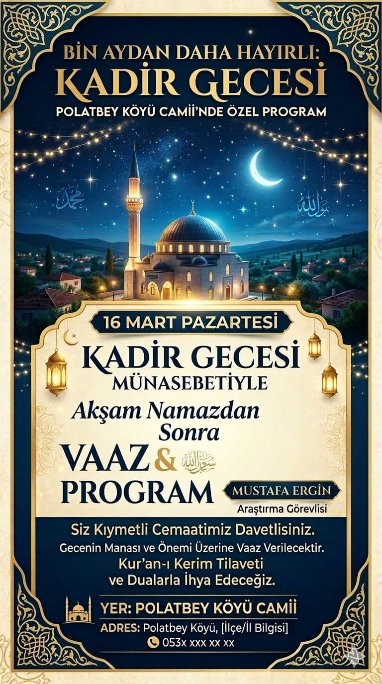 Arş. Gör. Mustafa Ergin, "İlim ve Hikmet Dersleri" kapsamında Polateli İlçesi Polatbey Köyü Mehmet Özdemir Camii’nde Kadir gecesinin anlam ve önemine dair vaazda bulundu.