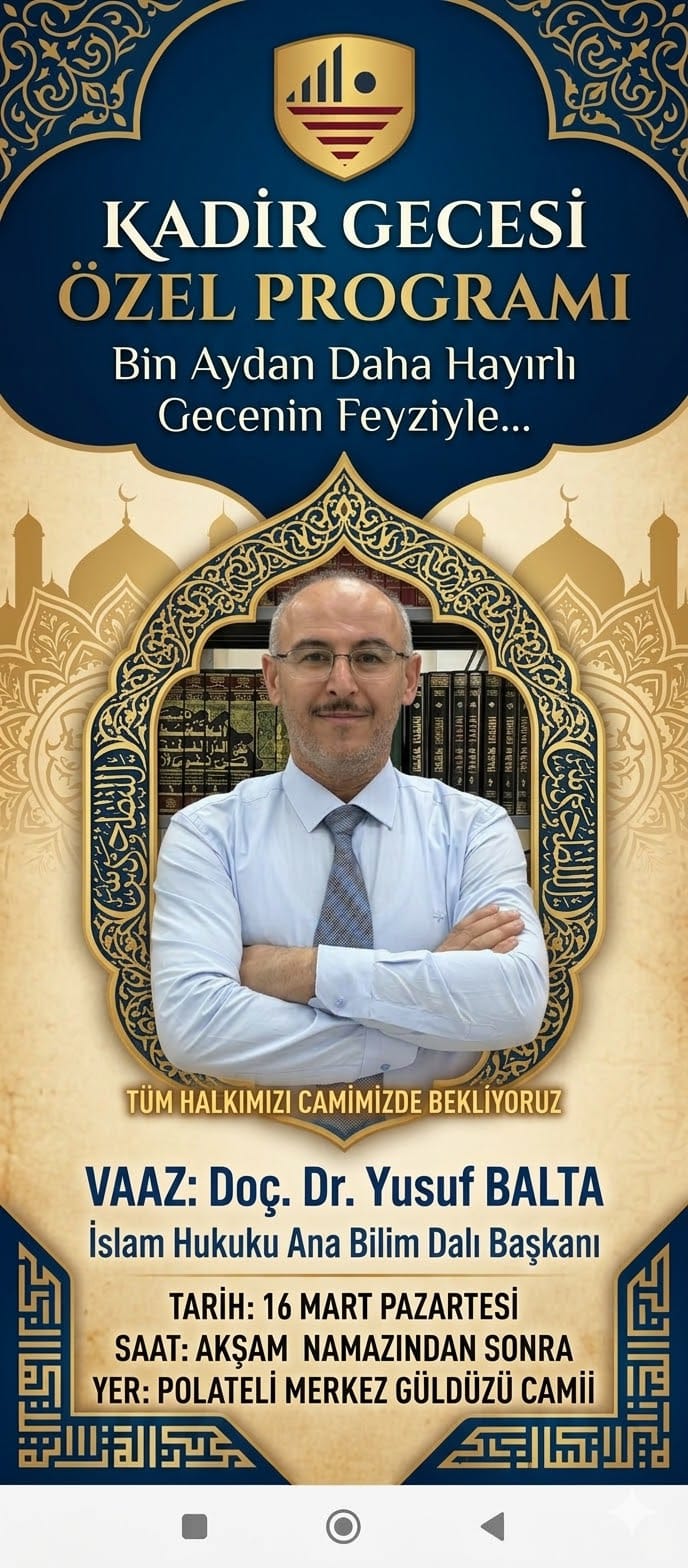 Polateli müftülüğü Kadir gecesi özel programı münasebetiyle Merkez Camii'nde yapılan özel programda hocamız Doç. Dr. Yusuf Balta konuşma icra etmiştir.