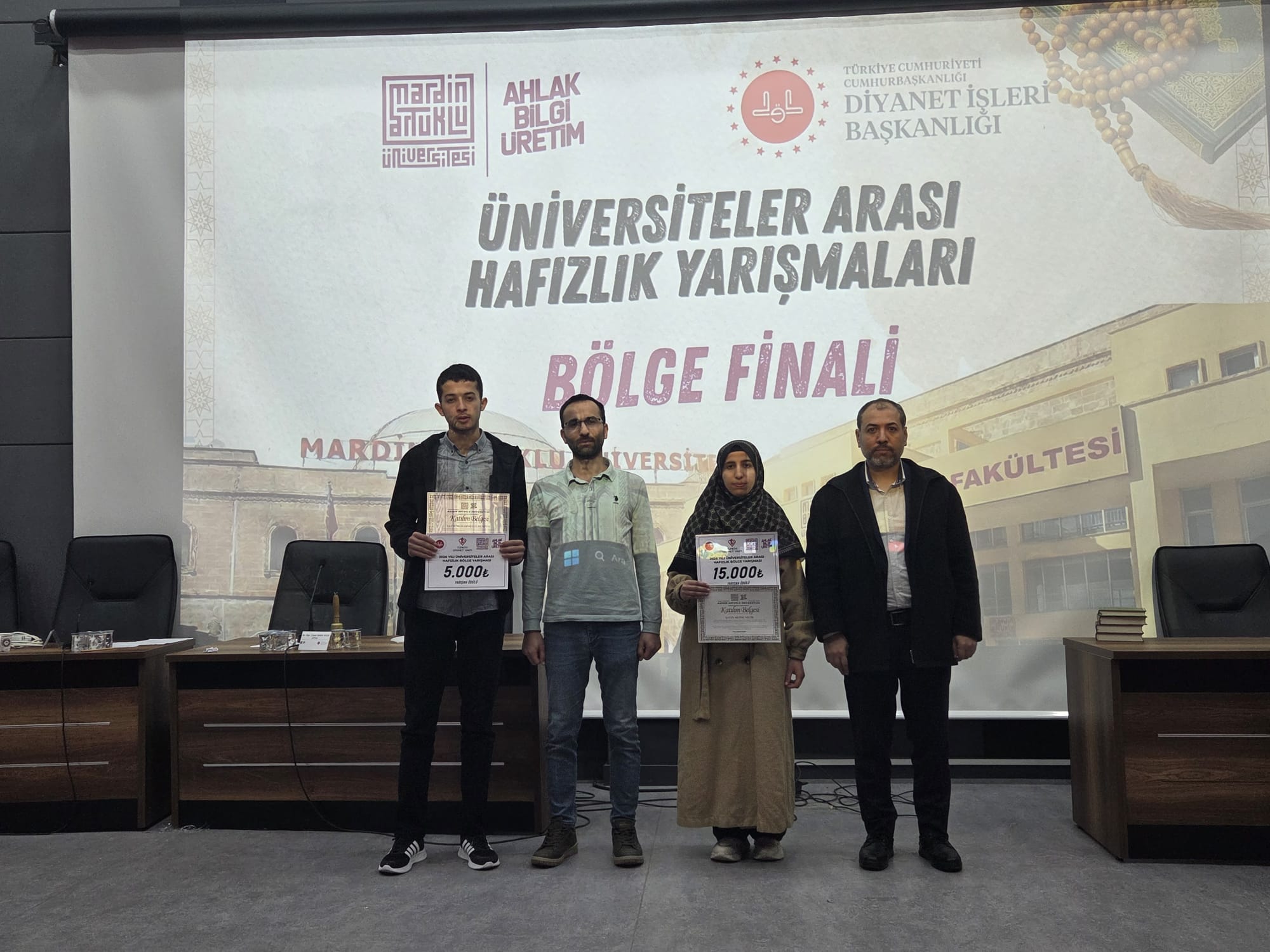 T.C. Cumhurbaşkanlığı Diyanet İşleri Başkanlığı tarafından düzenlenen Üniversiteler Arası Hafızlık Yarışmaları Bölge Finali’nde üniversitemizi temsil eden fakültemiz öğrencisi Muine Necib birinci olmuştur. Öğrencimizi yarışmaya hazırlayan ve kendisine refakat eden Kur'an-ı Kerim Okuma ve Kıraat Ana Bilim Dalı Başkanı’mız Öğr. Gör. Ömer Mehmet Ulusoy ve öğretim elemanımız Öğr. Gör. Mehmet Şeker'i tebrik eder; hayırlı ve bereketli çalışmalarının devamını dileriz.